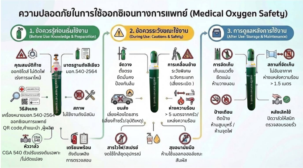 บทความนี้ได้รวบรวมแนวทางความปลอดภัยที่สำคัญ ตั้งแต่ก่อนเริ่มใช้งาน ขณะใช้งาน ไปจนถึงหลังการใช้งาน เพื่อช่วยให้การใช้ออกซิเจนทางการแพทย์เป็นไปอย่างถูกต้อง ปลอดภัย และลดความเสี่ยงต่ออุบัติเหตุที่ไม่คาดคิด